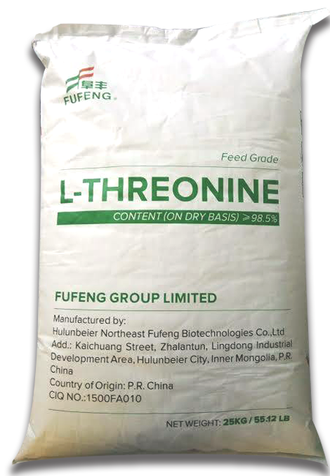 L-Threonine is used mainly in premixtures and pig feed, but also in poultry feed. it is the second limiting amino acid for pigs after Lysine and improves zootechnical performance and reduces nitrogen waste. It contains 99% L-Threonine Packaging L-Threonine can be delivered in 25-kilogram bags